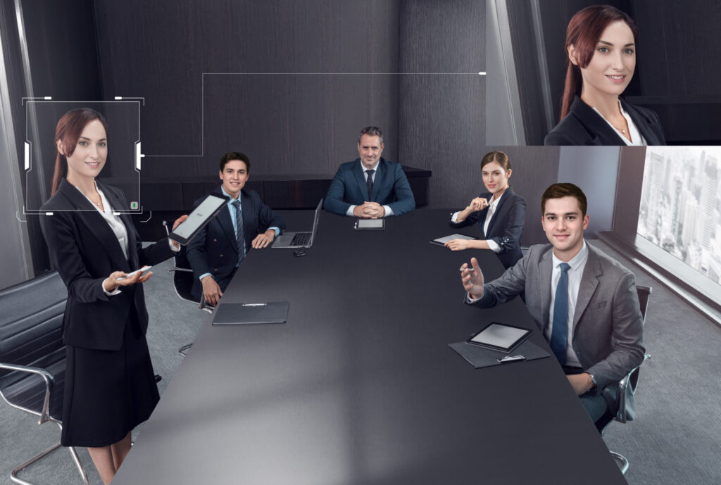 4,800万画素の広角カメラは、会議室の隅から隅まで映します。さらに発言者を自動で認識し、最適な構図を切り出すので、端の席からカメラに映る位置へ移動する必要はありません。